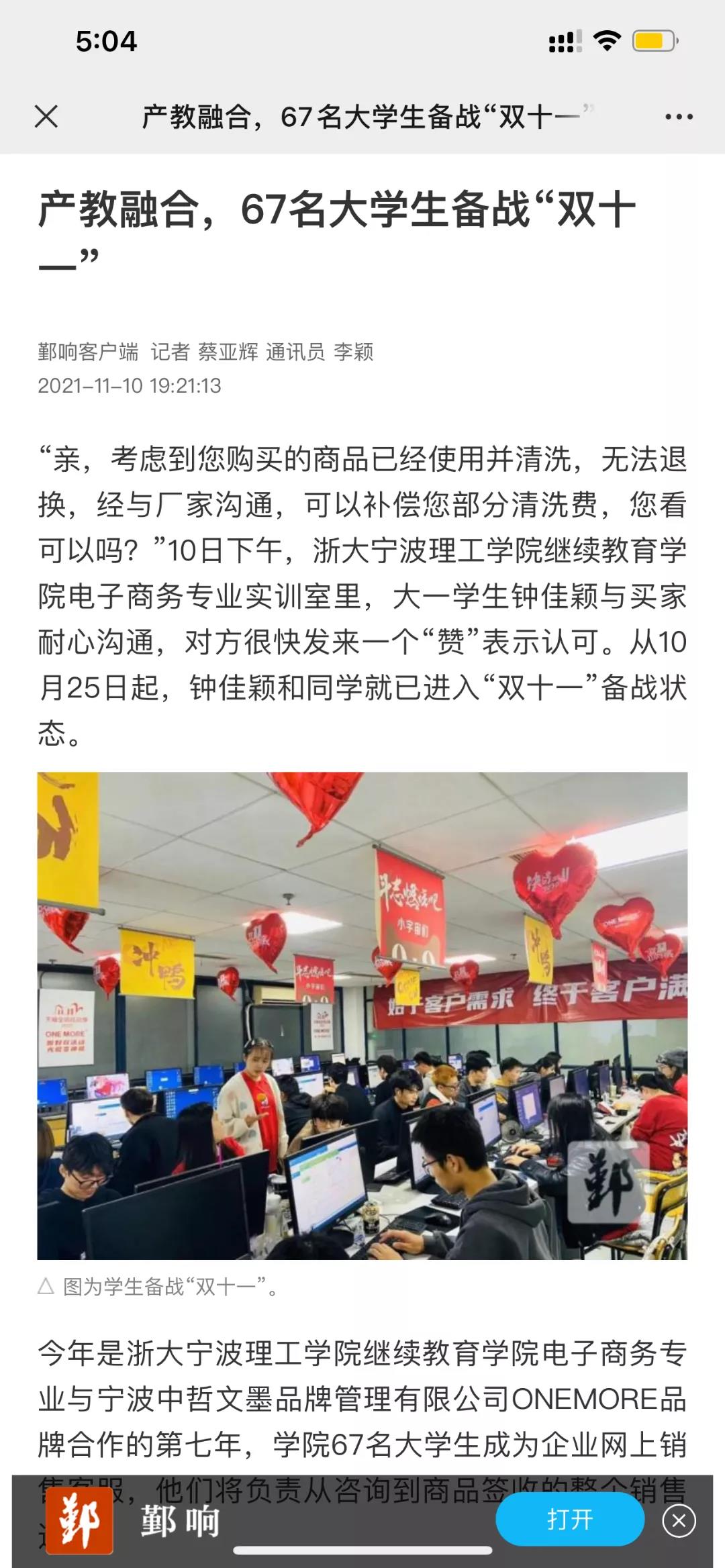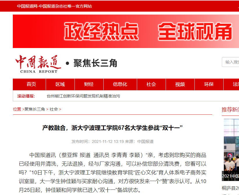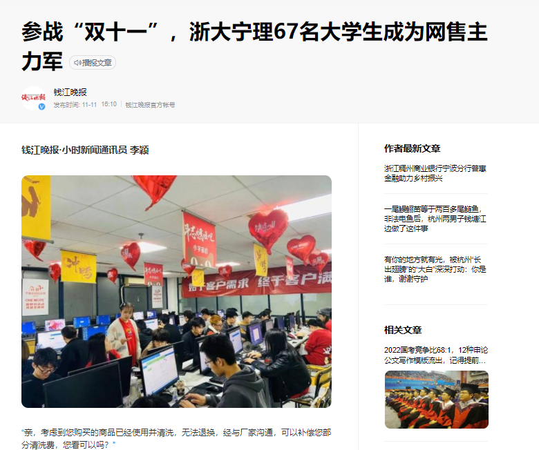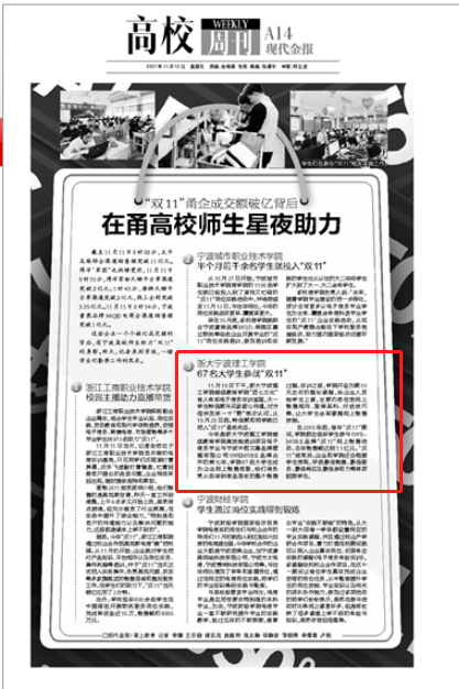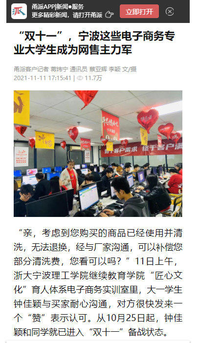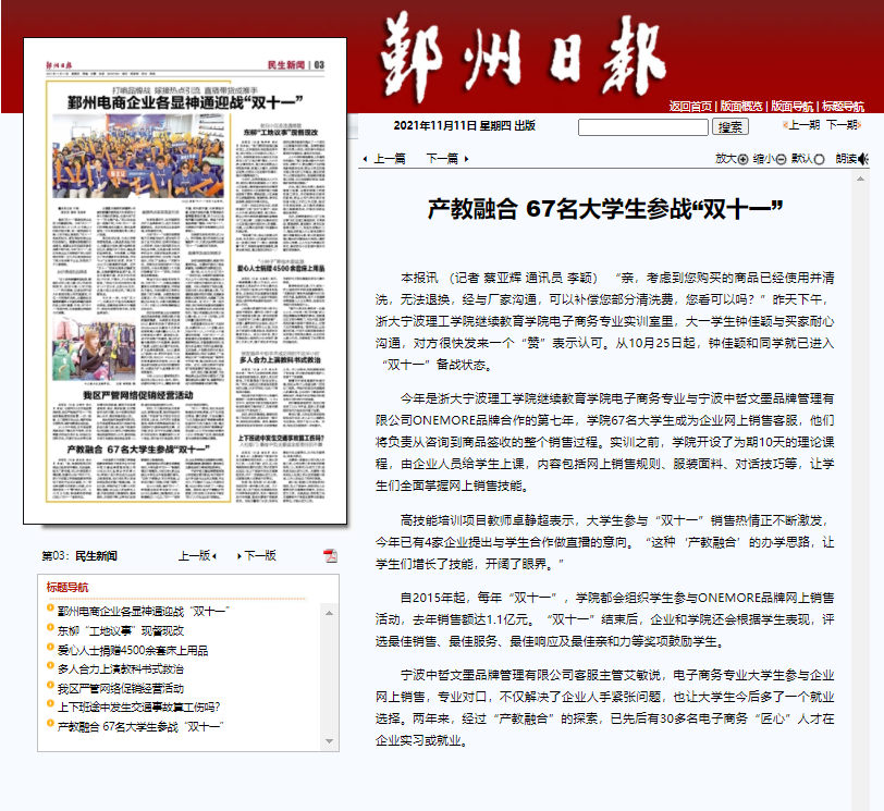 11月10日,鄞州日报以《产教融合,67名老员工参战“双十一”》为题,宣传报道了公司67名高技能培训项目电子商务专业员工参与ONEMORE品牌双十一活动,吸引中国报道、钱江晚报、现代今报和宁波新闻综合广播等8家媒体转载报道。