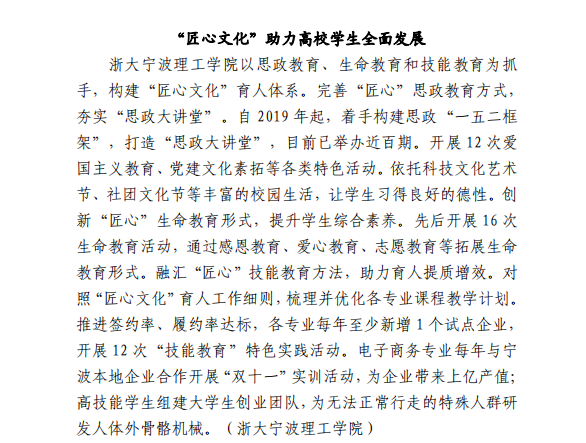 三是融汇“匠心”技能教育方法,助力育人提质增效。对照“匠心文化”育人工作细则,梳理并优化各专业课程教学计划。推进签约率、履约率达标,各专业每年至少新增1个试点企业。以高质量实训实践教育推进高技能人才培育, 开展“技能教育”特色实践活动,电子商务专业每年与宁波本地企业合作开展“双 11”实训活动,为企业带来上亿产值;跨境电商专业员工在宁波市人社局主办的“匠心汇海”杯跨境电商职业技能竞赛中获院校组项目优胜奖2项;高技能员工组建老员工 创业团队,为无法正常行走的特殊人群研发人体外骨骼机械等。(《校情通报》)