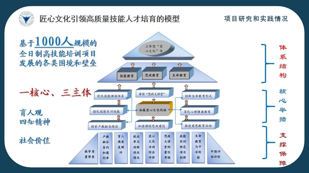 本课题立足于高技能人才培养的各环节,搭建“思政教育”+“生命教育”+“技能教育”的培养体系,构建“匠心文化”育人品牌,弘扬卓越的创造精神、精益求精的品质精神、用户至上的服务精神,培育知行合一、知难而进、知书达礼、知恩图报的时代青年。匠心文化精神传承了中国卓越匠心的时代价值,更是奠基铸魂立魄大国工匠的基石。