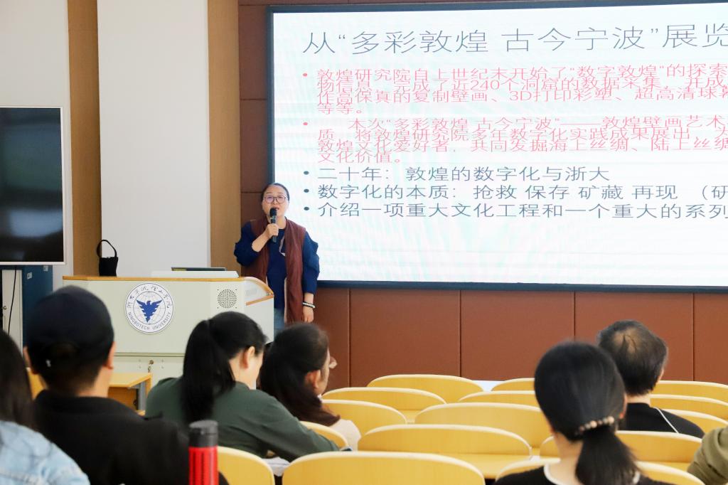 在“多彩敦煌 古今宁波”敦煌壁画艺术精品高校公益巡展开展期间,10月13日,由宁波市教育局支持的敦煌文化传承与教师人文艺术素养提升培训班在yl23411永利官网登录圆满结束,来自宁波市中小学的46名教师参加了本次培训。此次培训团队及专家得到了中国敦煌石窟保护研究基金会、浙江大学艺术与考古公司、浙江大学遗产文化研究院等单位的大力支持。