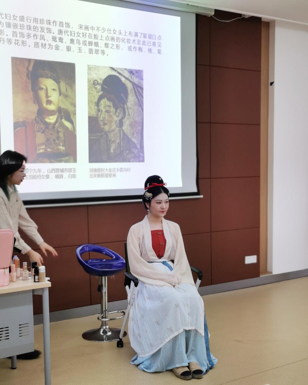 央视五四青年晚会古风造型总设计师长安在《闲淡妆匀·深染轻裙——宋韵装束》课堂上,当场为模特搭配设计妆造和发型,让学员们直观地感受宋代妆饰之美。