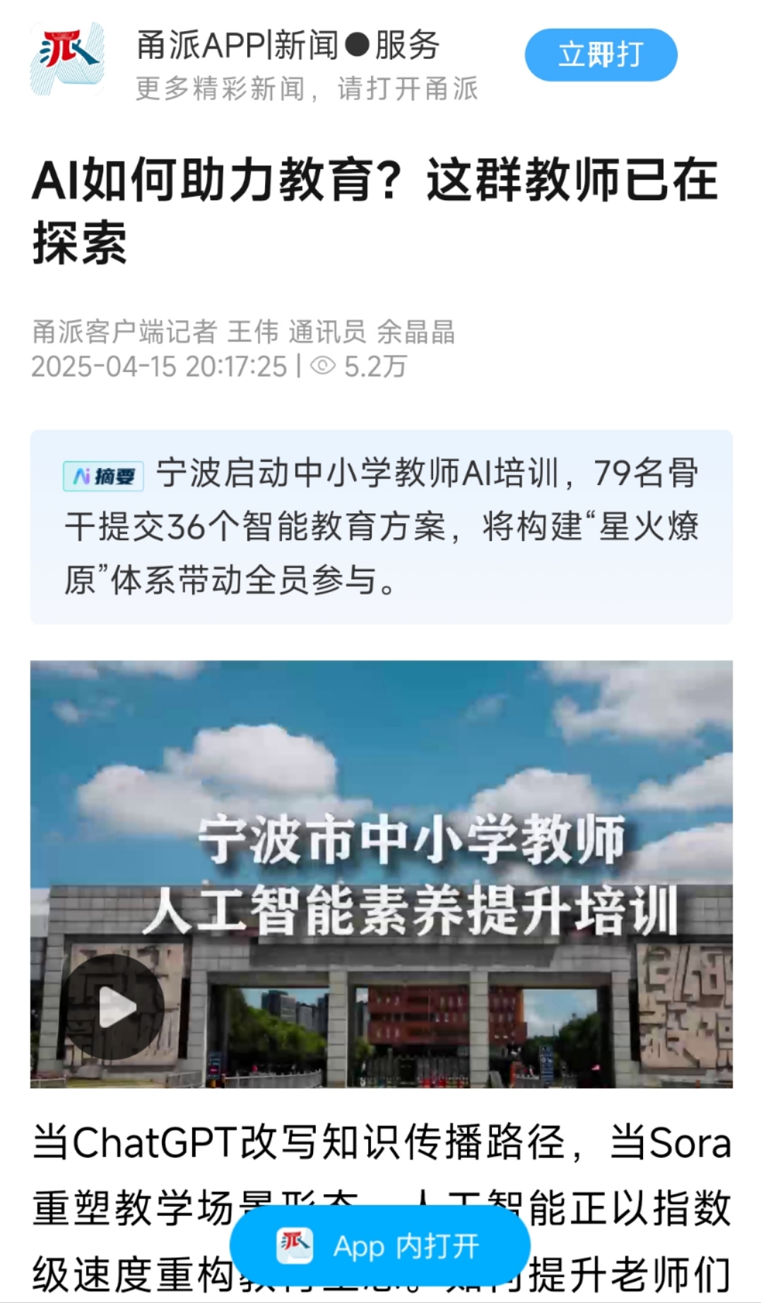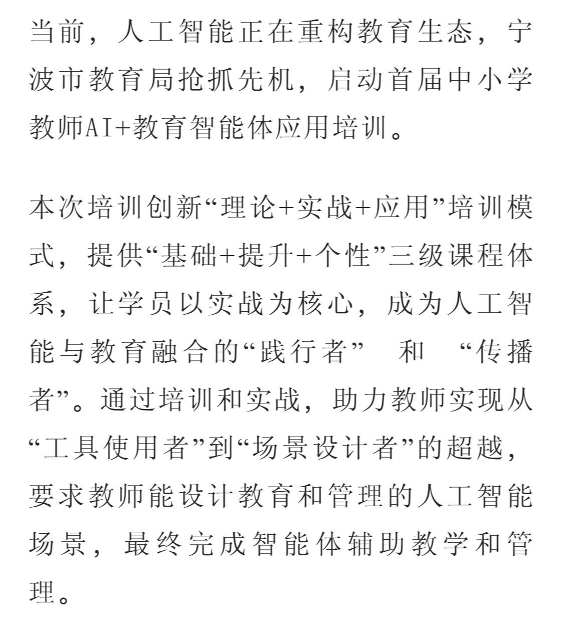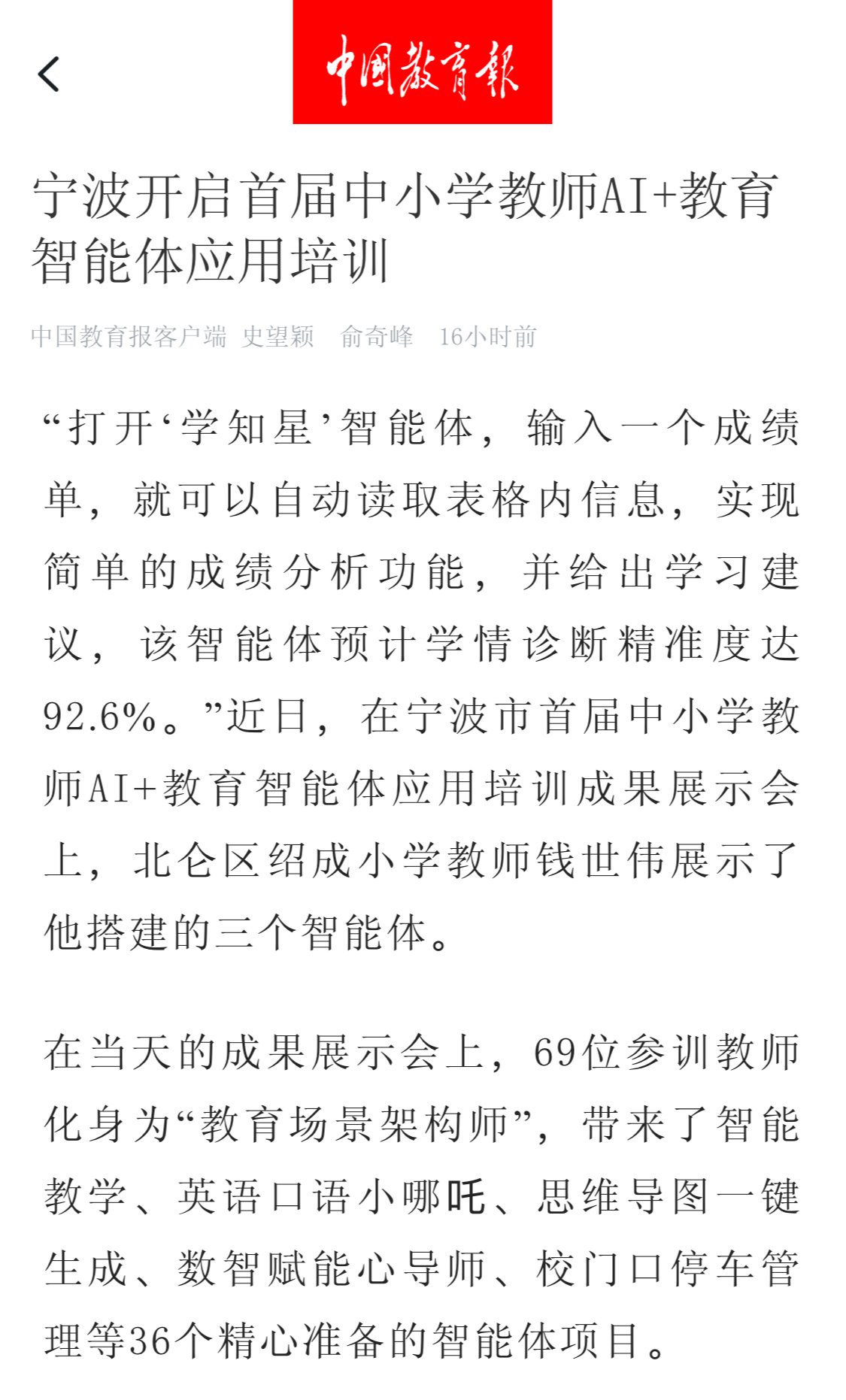 1.中国教育报客户端:宁波开启首届中小学教师AI+教育智能体应用培训