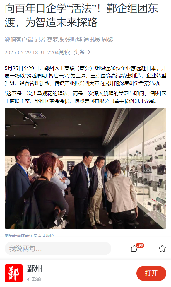 5月25日至29日,鄞州区工商联(商会)组织近30位企业家远赴日本,开展一场以“跨越周期·智启未来”为主题,重点围绕高端精密制造、企业转型升级、经营管理创新、传统产业振兴四大方向展开的深度研学考察活动。 “这不是一次走马观花的拜访,而是一次深入肌理的学习与叩问。”鄞州区工商联主席、鄞州区商会会长、博威集团有限公司董事长谢识才介绍。