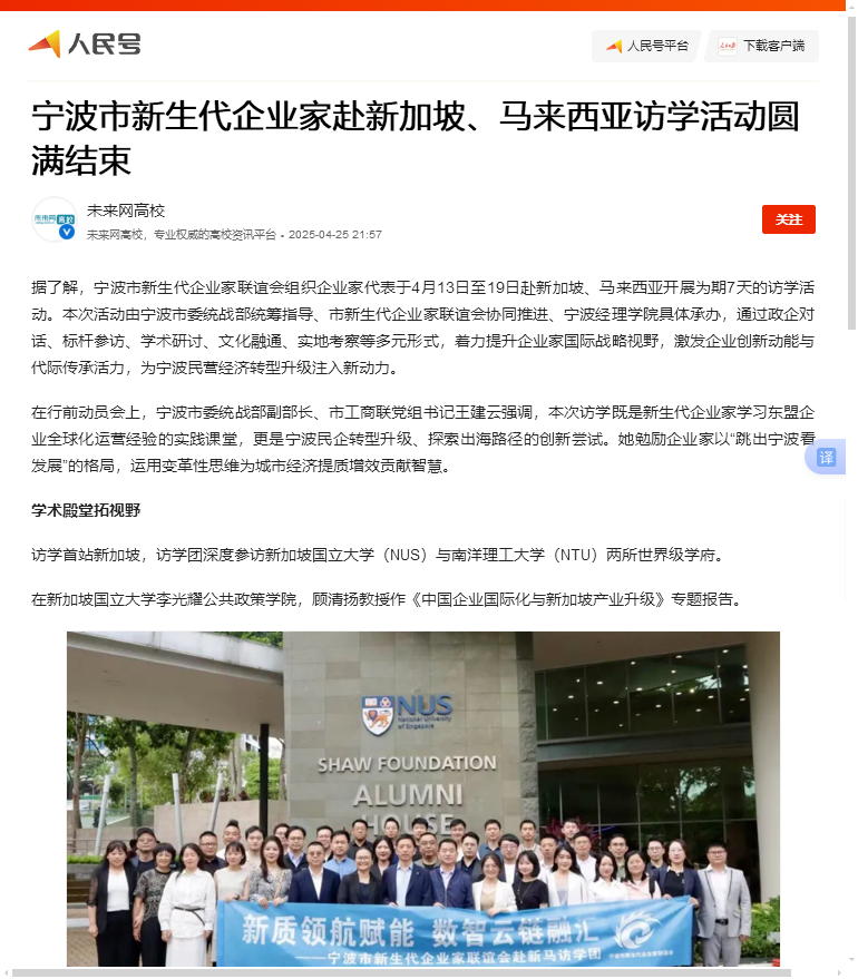 4月13日至19日,宁波市新生代企业家联谊会组织企业家代表赴新加坡、马来西亚开展为期7天的访学活动。本次活动由宁波市委统战部统筹指导、市新生代企业家联谊会协同推进、宁波经理公司具体承办,通过政企对话、标杆参访、学术研讨、文化融通、实地考察等多元形式,着力提升企业家国际战略视野,激发企业创新动能与代际传承活力,为宁波民营经济转型升级注入新动力。访学活动获人民号、未来网等6个媒体平台报道: