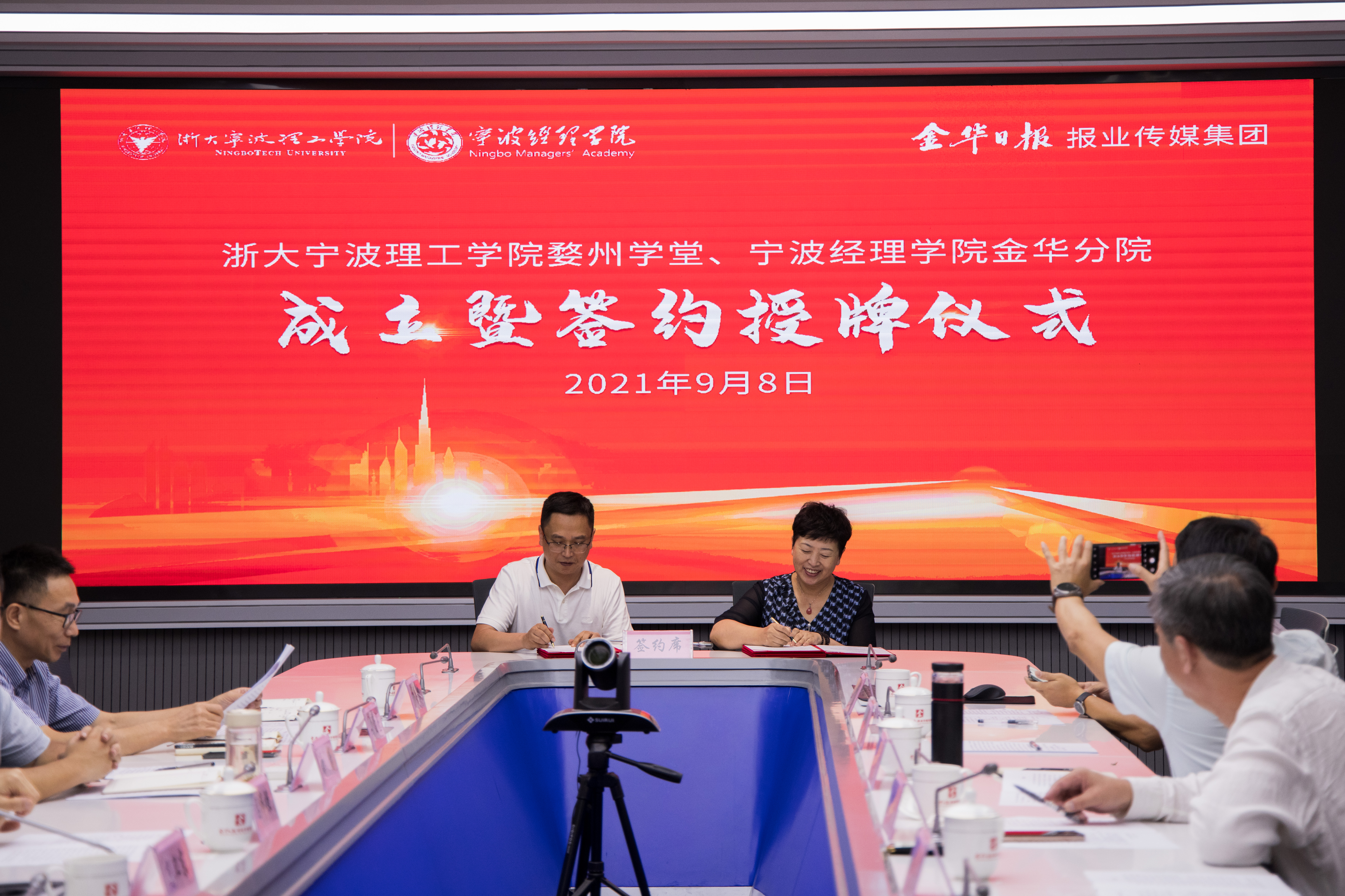 浙大宁波理工公司党委书记胡征宇,金华市委常委、宣传部部长吕伟强,金华日报报业传媒集团党委书记、社长徐赞参加签约仪式并讲话。金华日报报业传媒集团党委副书记、总编辑范卫东主持仪式。