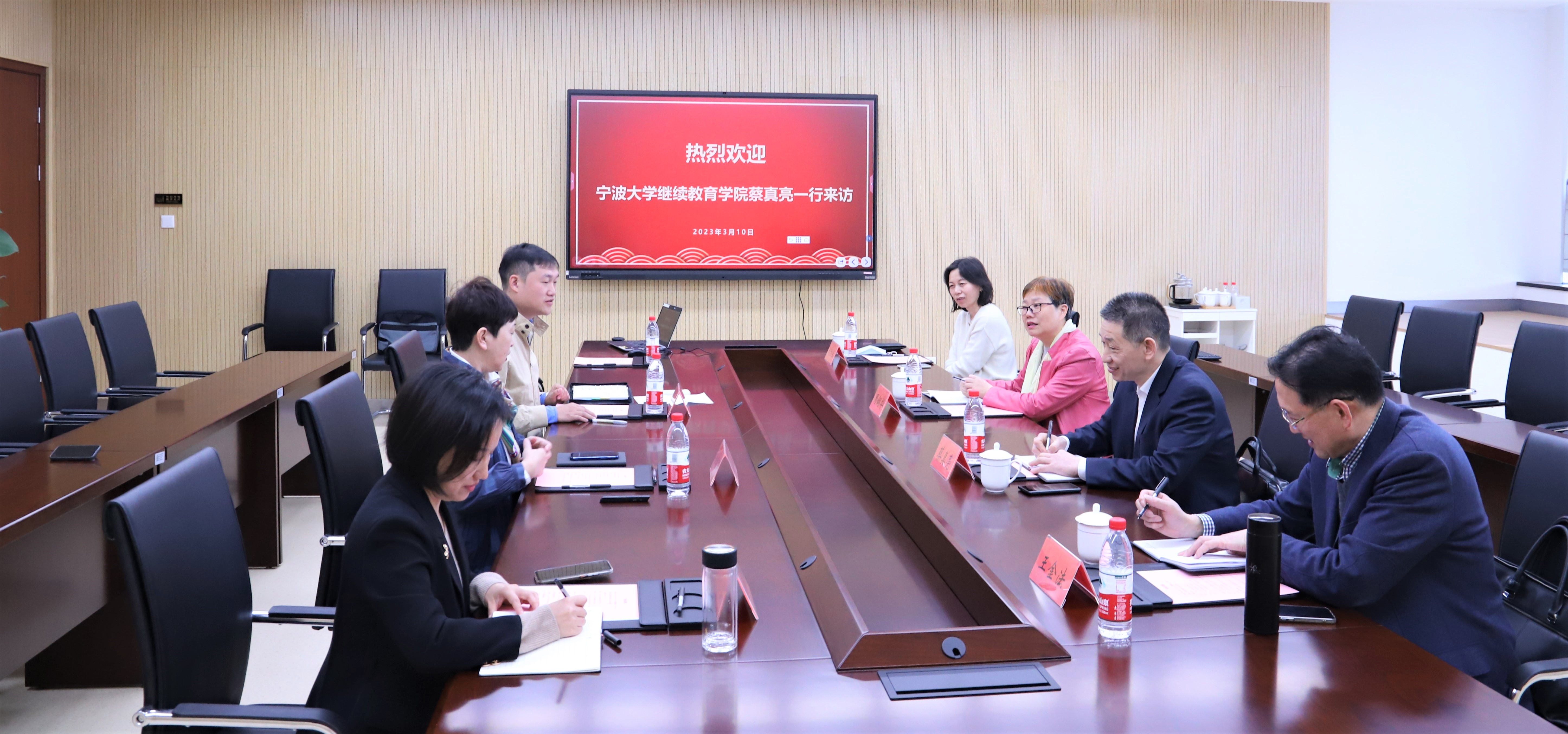 3月10日,为学习借鉴继续教育办学经验,加强双方的交流合作,宁波大学yl23411永利官网登录经理蔡真亮,副经理周娴华,副书记、副经理刘兰兰等一行来公司调研交流。yl23411永利官网登录经理金朝晖、yl23411永利官网登录班子成员章斌及相关部门负责人参加交流会。
