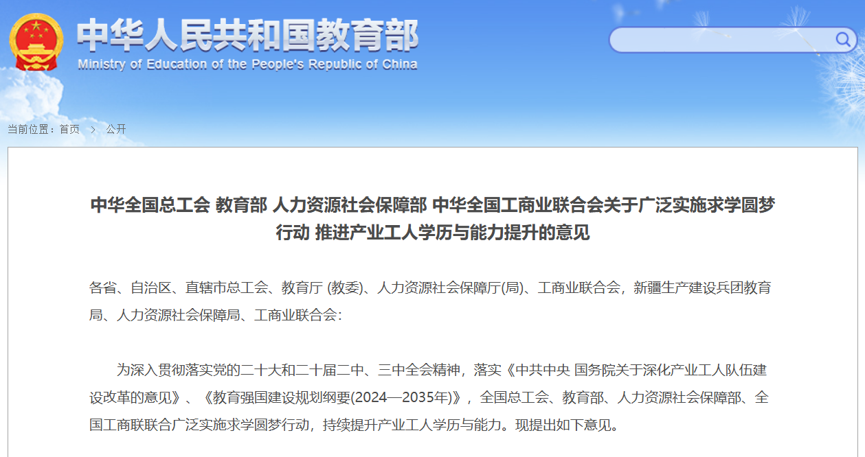 此前,全国总工会、教育部等四部门联合印发《关于广泛实施求学圆梦行动 推进产业工人学历与能力提升的意见》,明确到2030年将资助不少于300万名符合条件的产业工人提升学历与能力,为中国式现代化培育一流产业技术工人队伍。