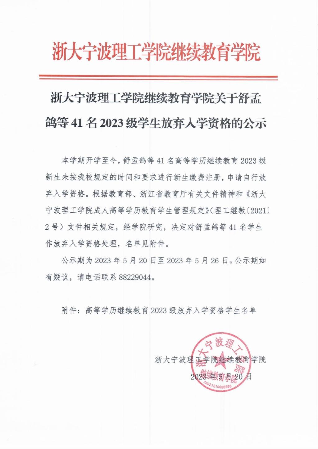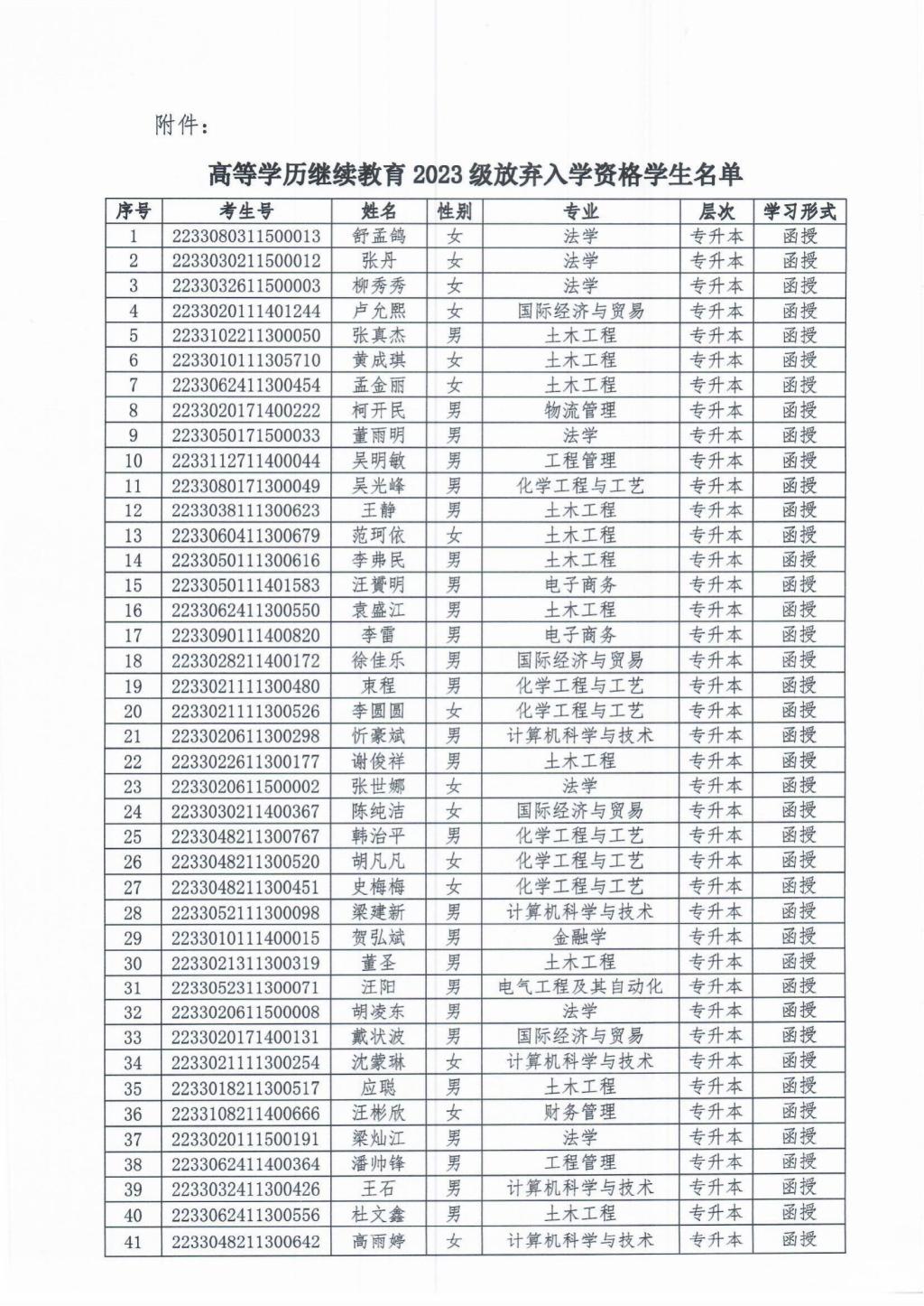 yl23411永利官网登录关于舒孟鸽等41名2023级员工放弃入学资格的公示