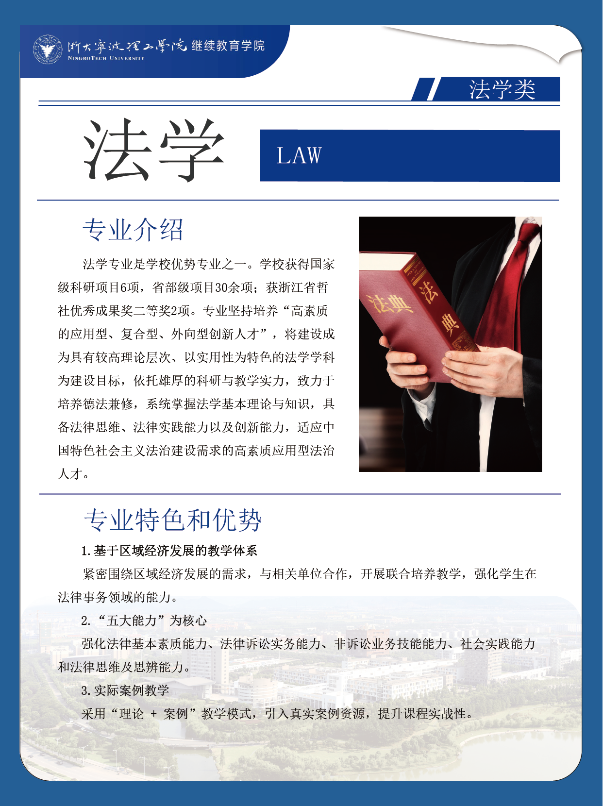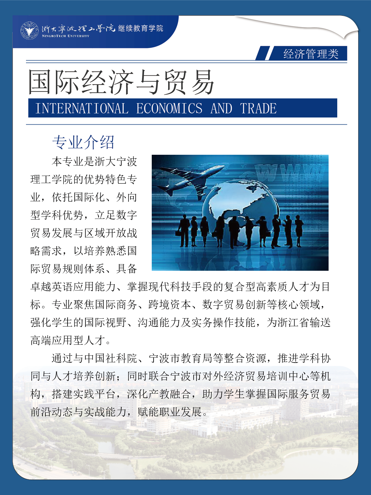 2025年招生专业(最终招生专业与计划以浙江省教育考试院公布为准):国际经济与贸易、工程管理、财务管理、电子商务、金融学、物流管理、国际商务、机械设计制造及其自动化、计算机科学与技术、土木工程、电子信息工程、电气工程及其自动化、化学工程与工艺、法学。